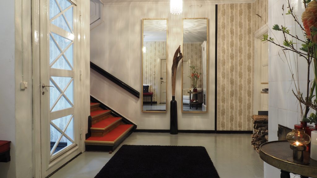 Guests have a main entrance on north side of the house. In lobby is place where to leave coats and shoes. It is possible to get slippers or traditional woollen socks for use if needed (floors in almost hundred years old might feel cool). Red stairs lead you up to 2nd floors accommodation facilities.